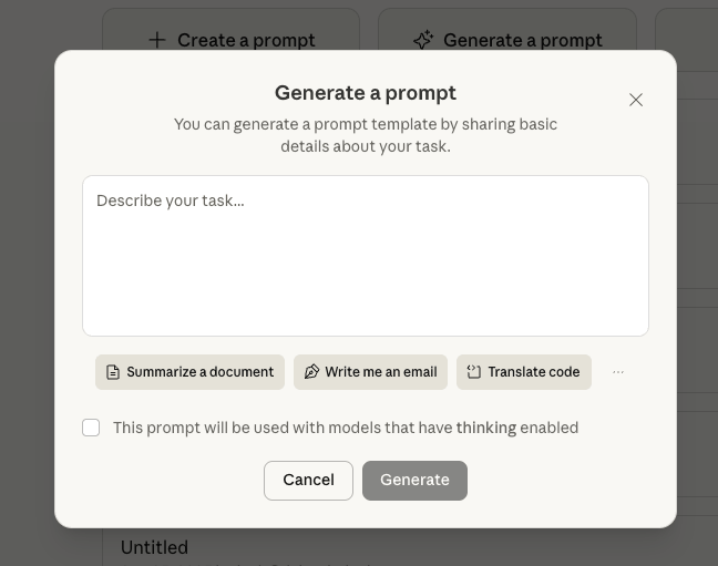 I go back to the Claude Console and I click on the Generate-a-prompt button on the Dashboard.