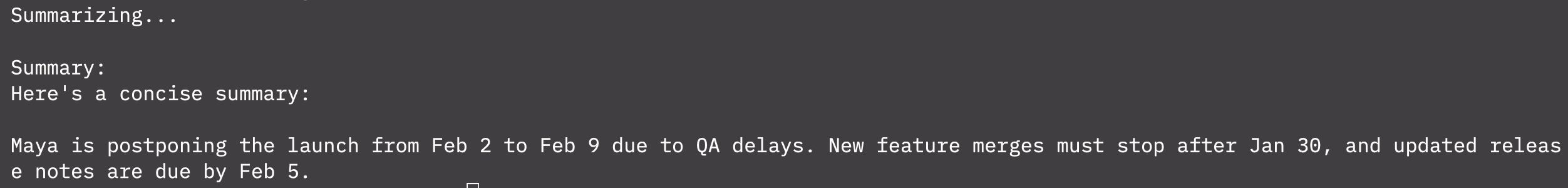 pnpm start "Hi team—We’re moving the launch from Feb 2 to Feb 9 due to QA delays. Please stop new feature merges after Jan 30. We need updated release notes by Feb 5. -Maya