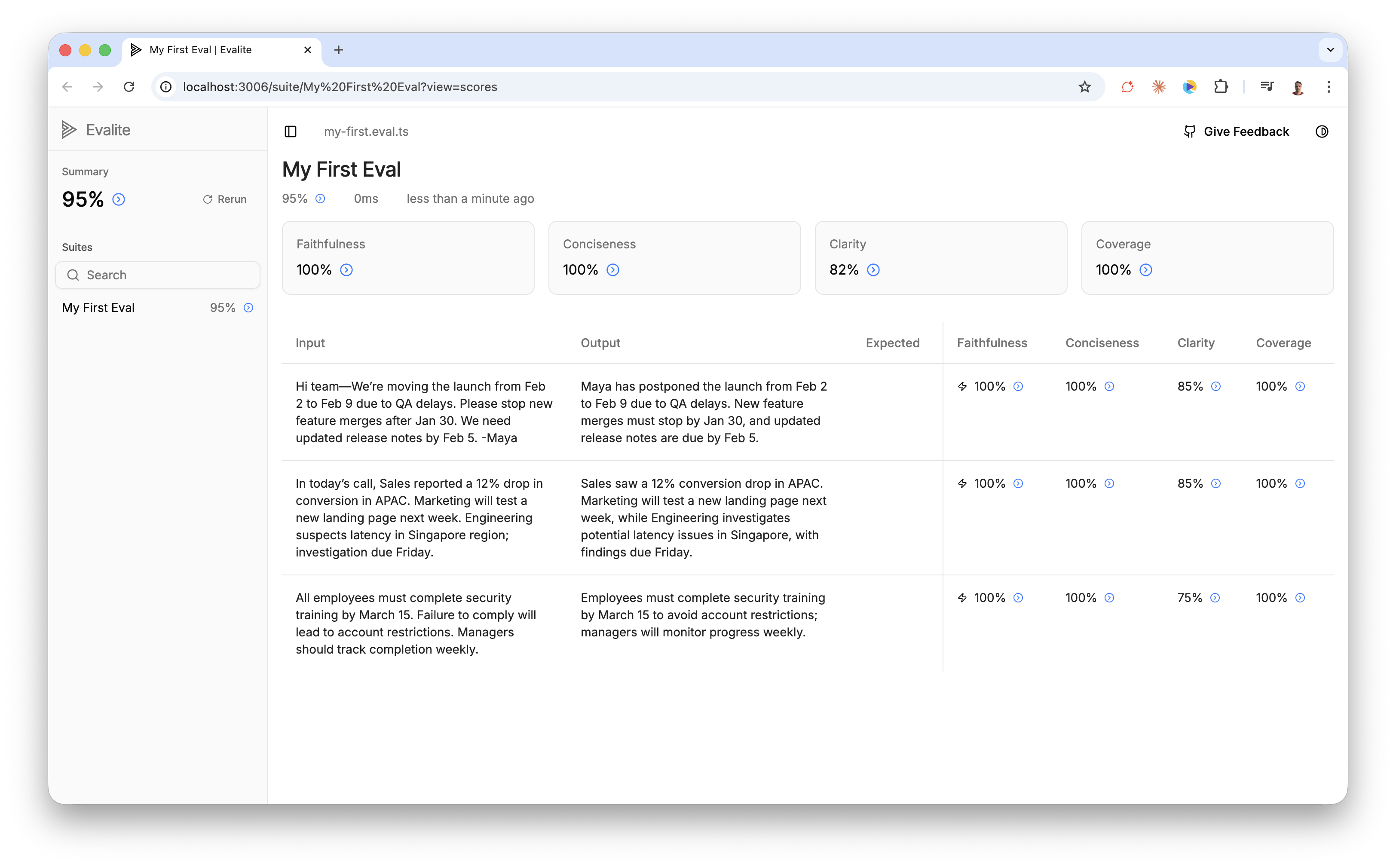 You can see Faithfulness, Conciseness and Coverage are all at 100%, but the Clarity score for each input wavers between 75% and 85%.