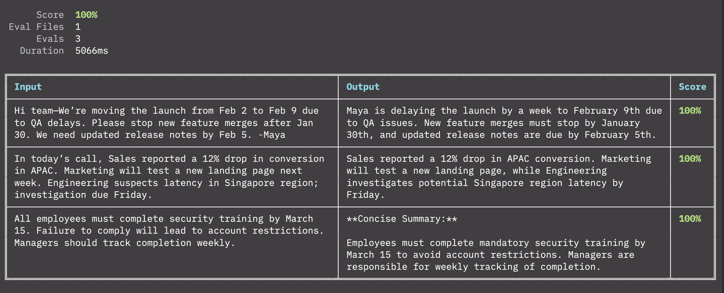 We now have 3 scores for 3 prompts.If we run the eval script again the total comes to…100%